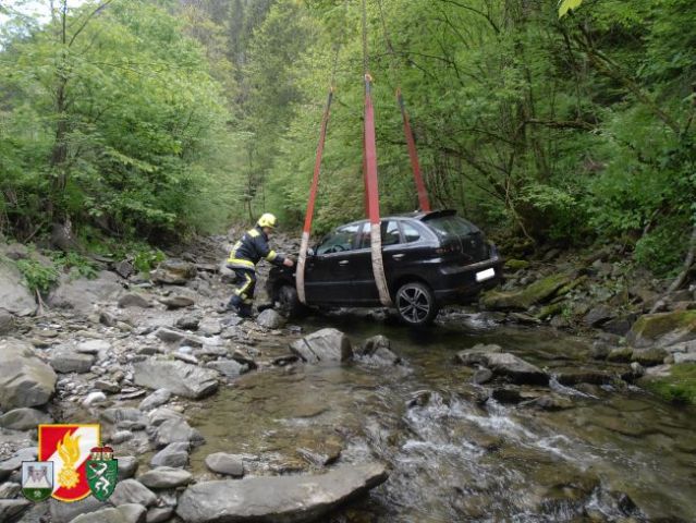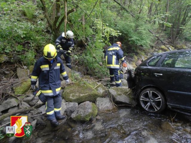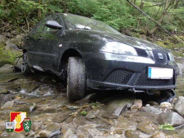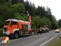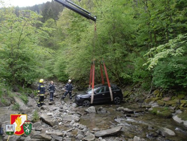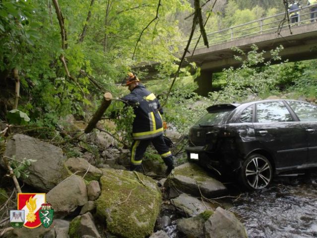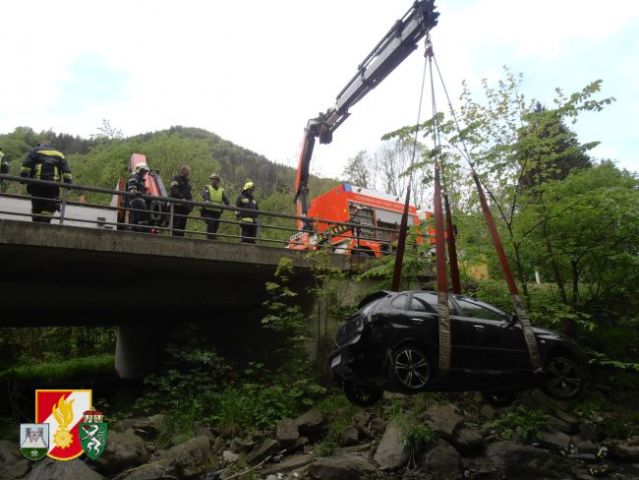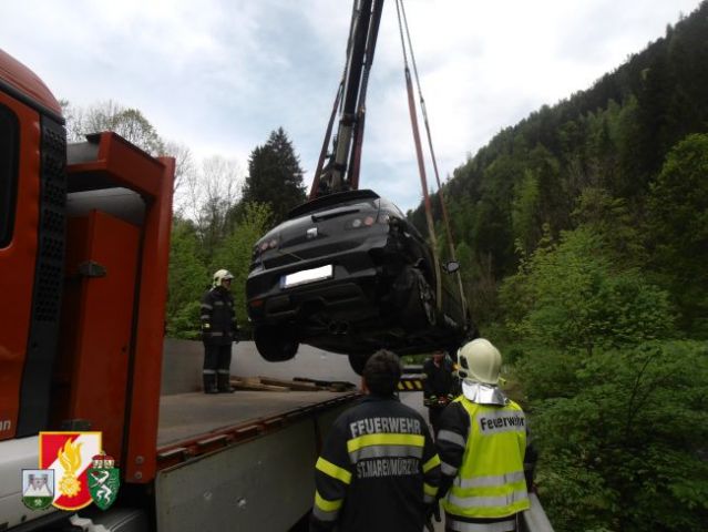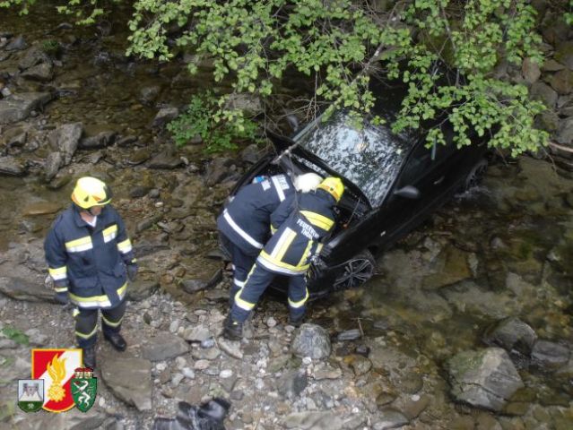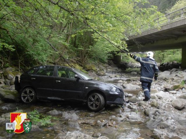 Daraufhin rückten sofort 6 Kameraden der FF-Thörl mit dem RLF-A 2000 zum Unfallort nahe der Stegerbrücke auf der B20 aus. Als man dort eintraf, wurde sofort die Unfallstelle abgesichert, weiters übernahm der Einsatzleiter die Erkundung an der Einsatzstelle. Um den PKW aus dem Bach bergen zu können, entschloss man sich, das SRF der FF-Kapfenberg/Stadt sowie den LKW der FF-St.Marein/Mzt. anfordern.