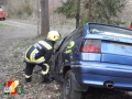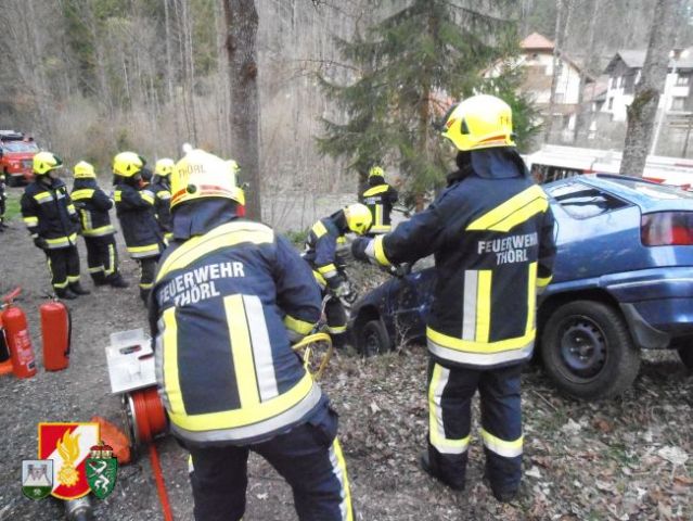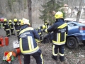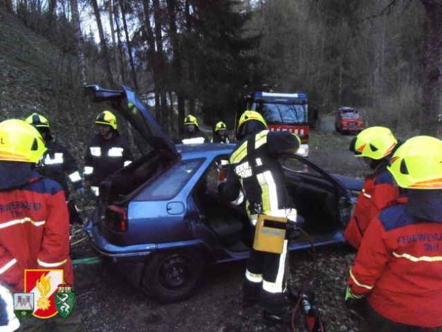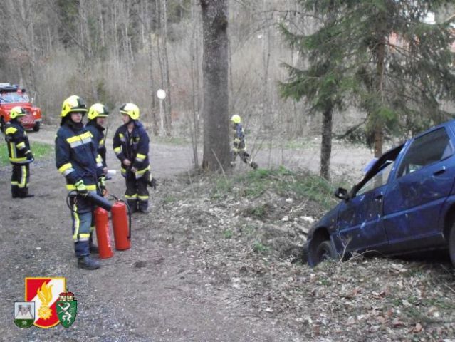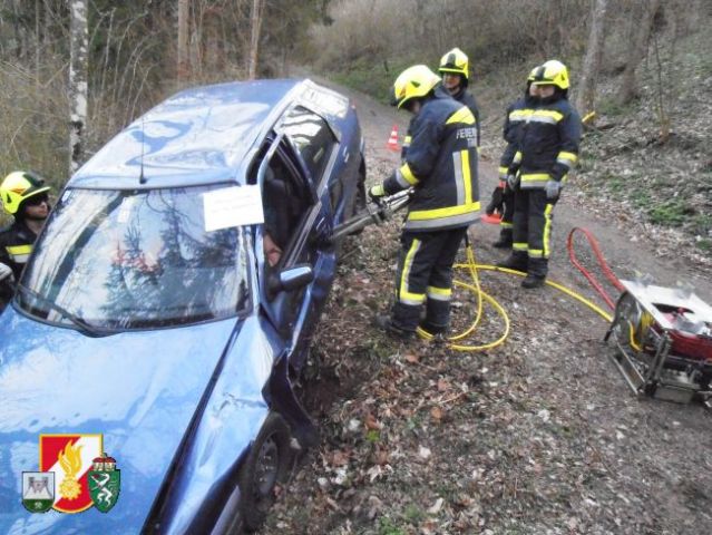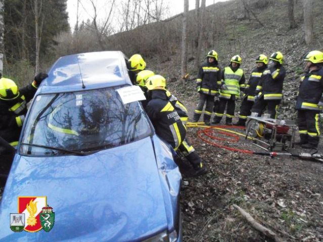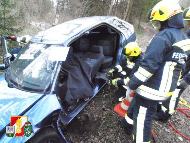 Die Mannschaft des RLF-A 2000 sicherte als erstes die Unfallstelle ab und errichtete einen Brandschutz. Weiters wurde der beschädigte PKW mittels Seilwinde des RFL-A 2000 und Umlenkrolle gegen das Abrutschen gesichert. Die Besatzung des LFB-A errichtete währenddessen mittels Höchstdruckanlage einen weiteren Brandschutz und einen Sanitätsplatz. Anschießend wurde die leicht verletzte Person aus dem Fahrzeug gerettet. Um die schwer verletzte Person retten zu können, musste die Fahrertür mittels hydraulischen Rettungsgerät aus dem PKW geschnitten werden. Danach konnte die verletzte Person gerettet werden und am Sanitätsplatz versorgt werden.