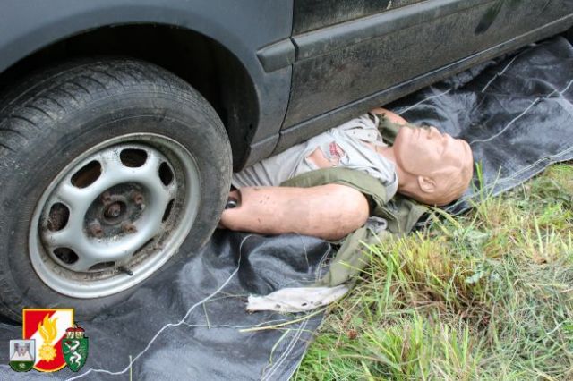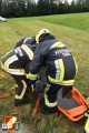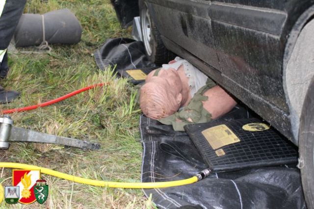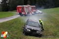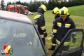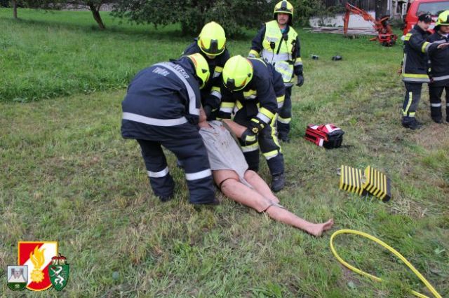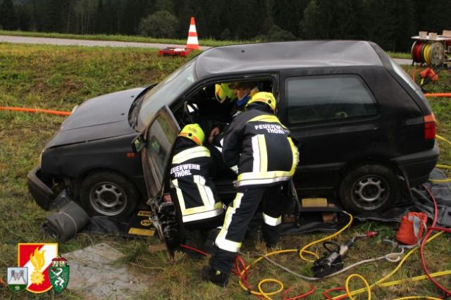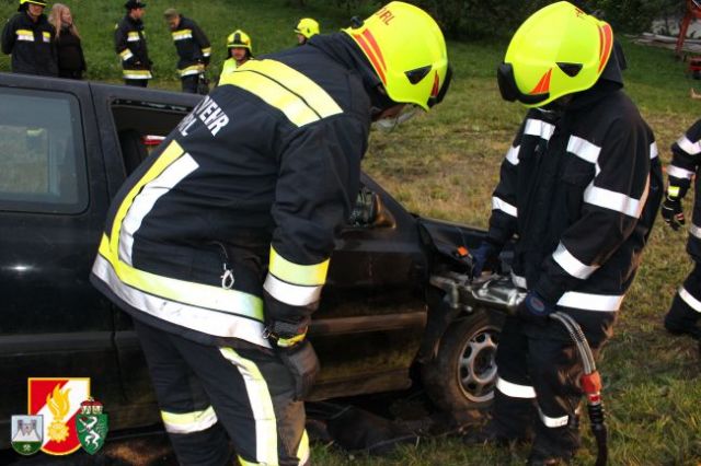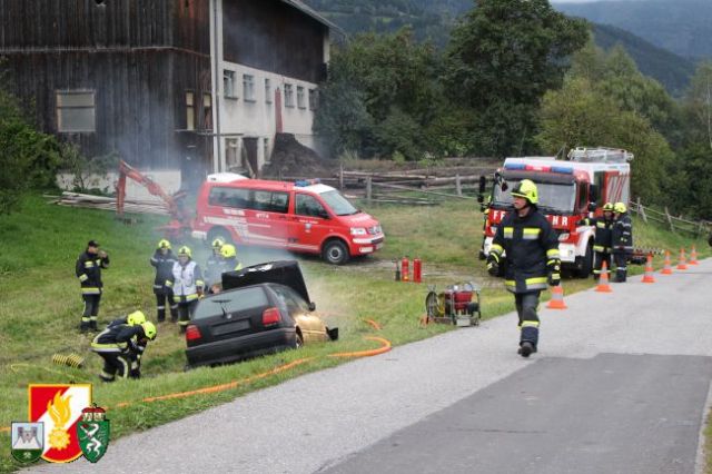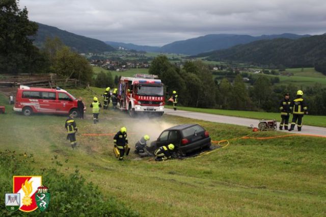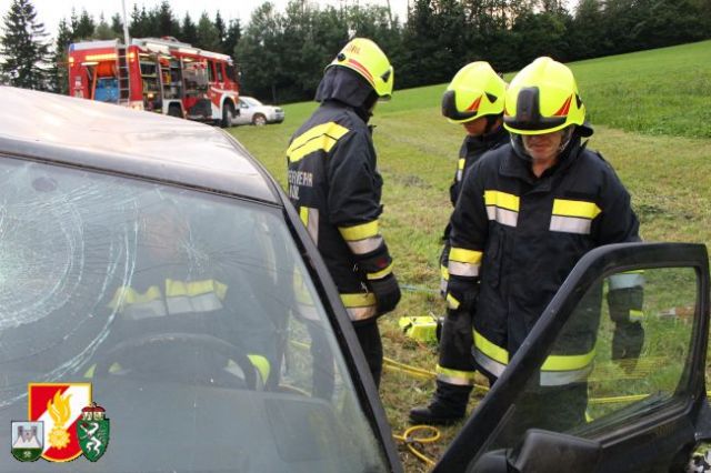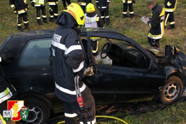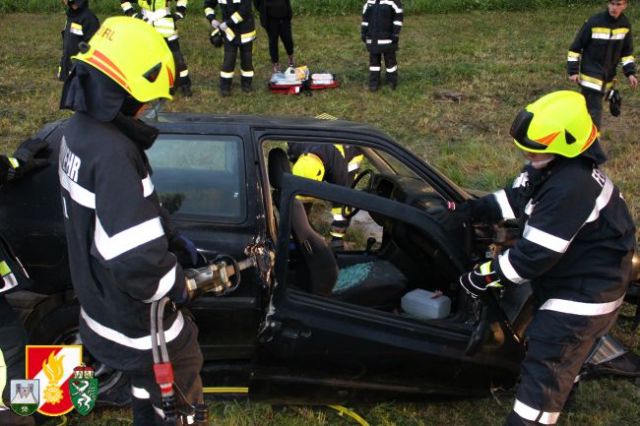 Nach dem Abruf von HBI Lukas Ebner rückten die Kameraden mit dem RLF-A 2000 und dem LFB-A zum Übungsort am Anwesen Grasser aus. Nach der Erkundung des Übungseinsatzleiters stellte sich heraus, dass der Fahrzeuglenker im PKW eingeklemmt war sowie der Beifahrer aus dem Fahrzeug geschleudert wurde und unter dem PKW zum Liegen kam. Weiters war aus dem Motorraum eine starke Rauchentwicklung zu erkennen. Daher wurde während der Absicherung der Unfallstelle sofort die "Brandbekämpfung" mittels HD-Rohr durchgeführt. Anschließend wurde das Fahrzeug stabilisiert und mittels pneumatischen Hebekissen angehoben. Damit konnte man den verletzten Beifahrer unter dem PKW retten und dem anwesenden Feuerwehrarzt zur weiteren Behandlung übergeben. Um den eingeklemmten Fahrzeuglenker aus seiner Zwangslage zu befreien, musste man die Autotür mittels hydraulischen Rettungsgerät öffnen sowie das Kupplungs- und Bremspedal entfernen. Im Anschluss daran konnte man schließlich auch ihn dem Feuerwehrarzt übergeben.
